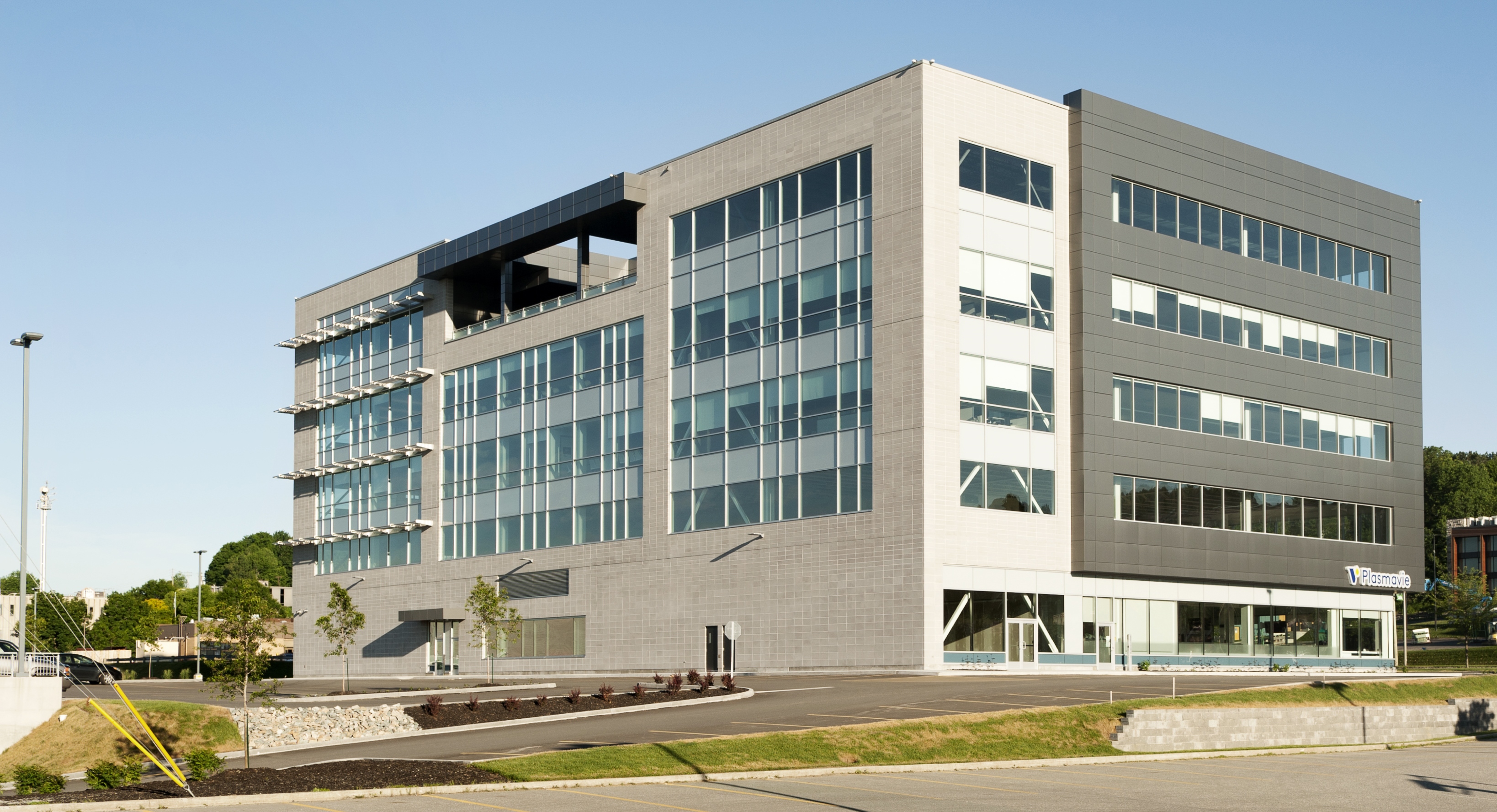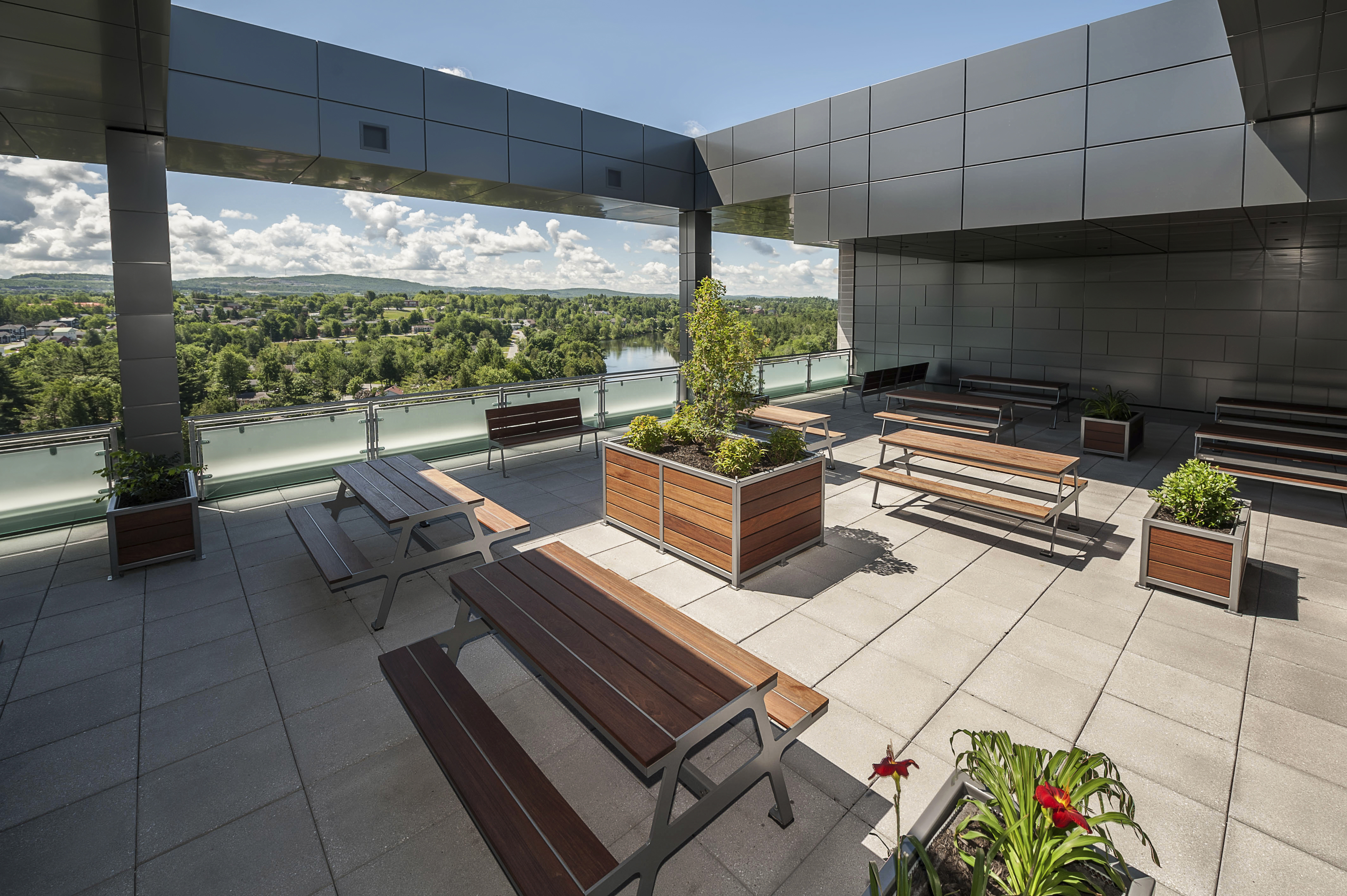 - Ascenseurs et terrasse végétalisée pour les employés sur le toit avec vue sur la rivière Magog et les monts Bellevue et Orford
